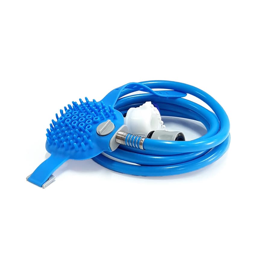 El depurador de pulverización de agua para mascotas es un cepillo de silicona suave con una función de 8 pies. manguera hecha para ser conectada a un grifo, simplemente use champú o jabón para mascotas y enjabúelo en el pelo de su mascota con el cepillo. El cepillo es fácil de agarrar ya que está equipado con una correa que puedes usar en tus nudillos.