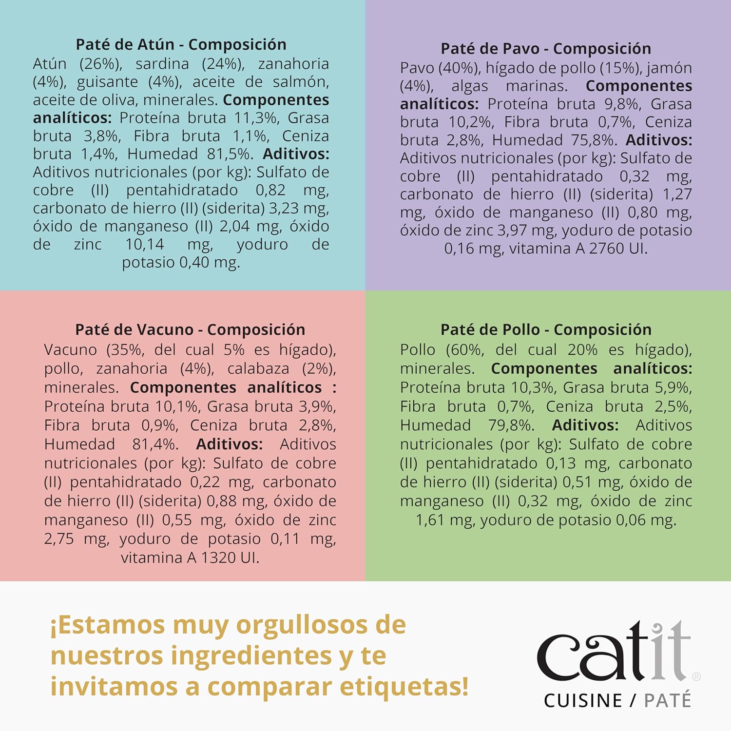 paté para gatos catit cuisine: Descubre el delicioso y nutritivo paté para gatos catit cuisine, una opción ideal para consentir a tu felino. Este paté completo, con un alto contenido en carne, es naturalmente rico en taurina, un componente esencial para la salud de tu gato. Su textura suave y su exquisito sabor lo convierten en un alimento irresistible, mientras que su alto contenido de agua contribuye a mantener una adecuada hidratación.