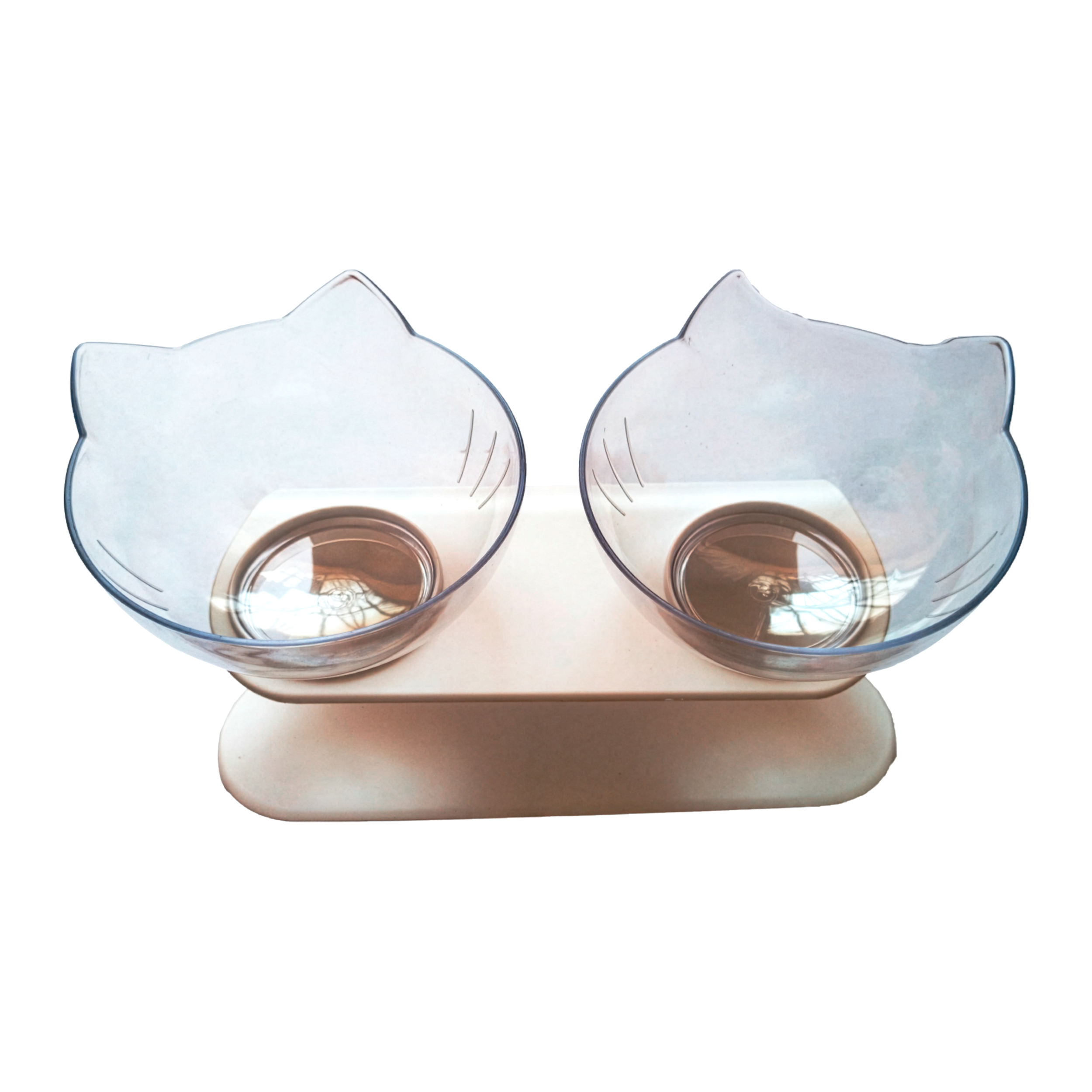 Comedero doble elevado con platos de acrílico transparente, diseñado para mejorar la postura de la mascota durante la alimentación.