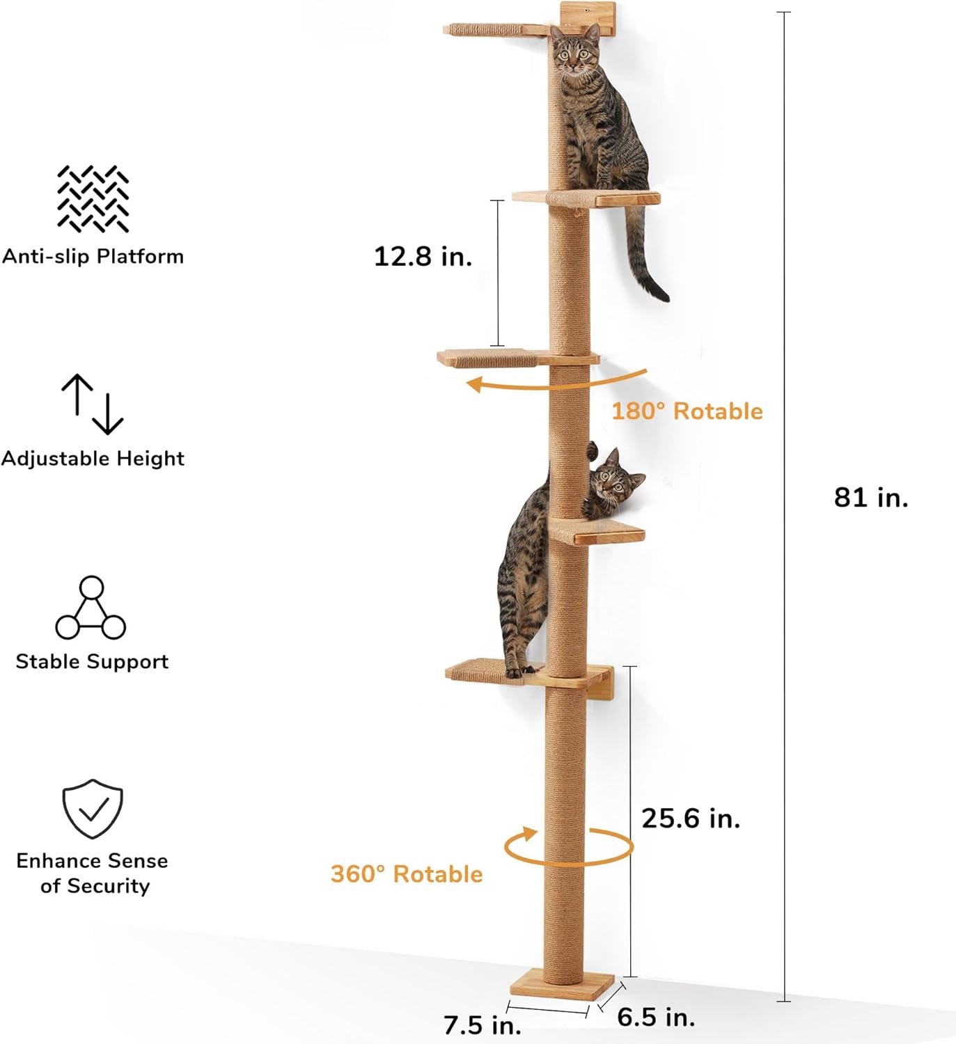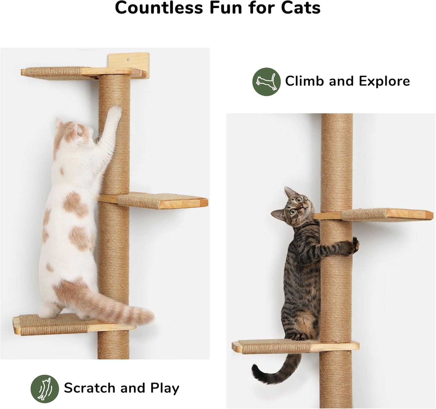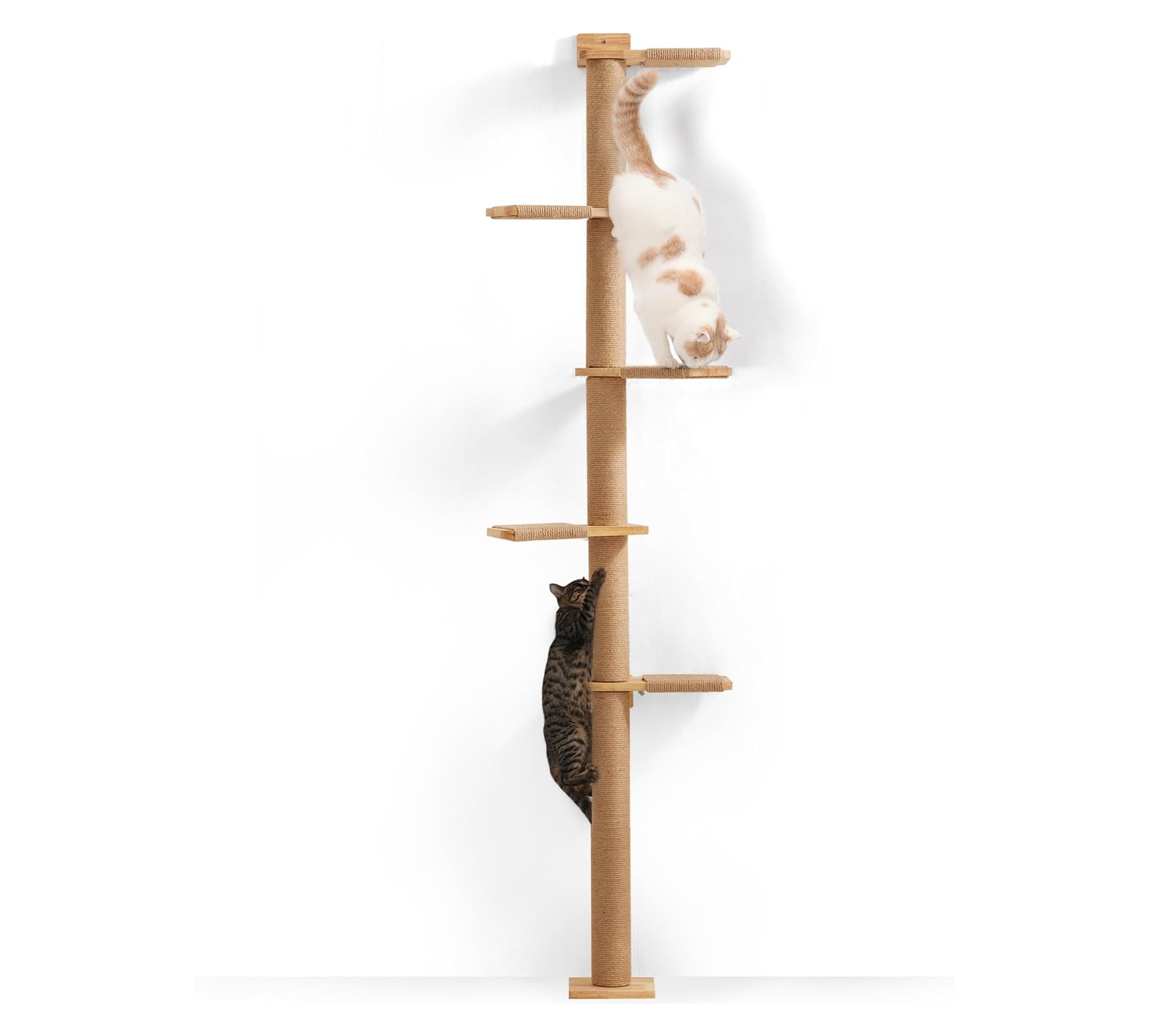 - Estabilidad y seguridad garantizadas: Su diseño montado en la pared asegura un soporte firme mientras tu gato juega y trepa. Las plataformas están cubiertas de cuerda de yute para evitar resbalones, ofreciendo máxima seguridad.