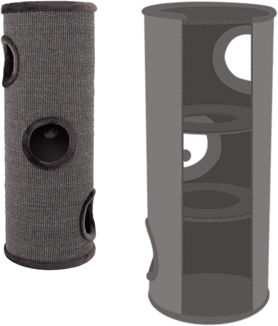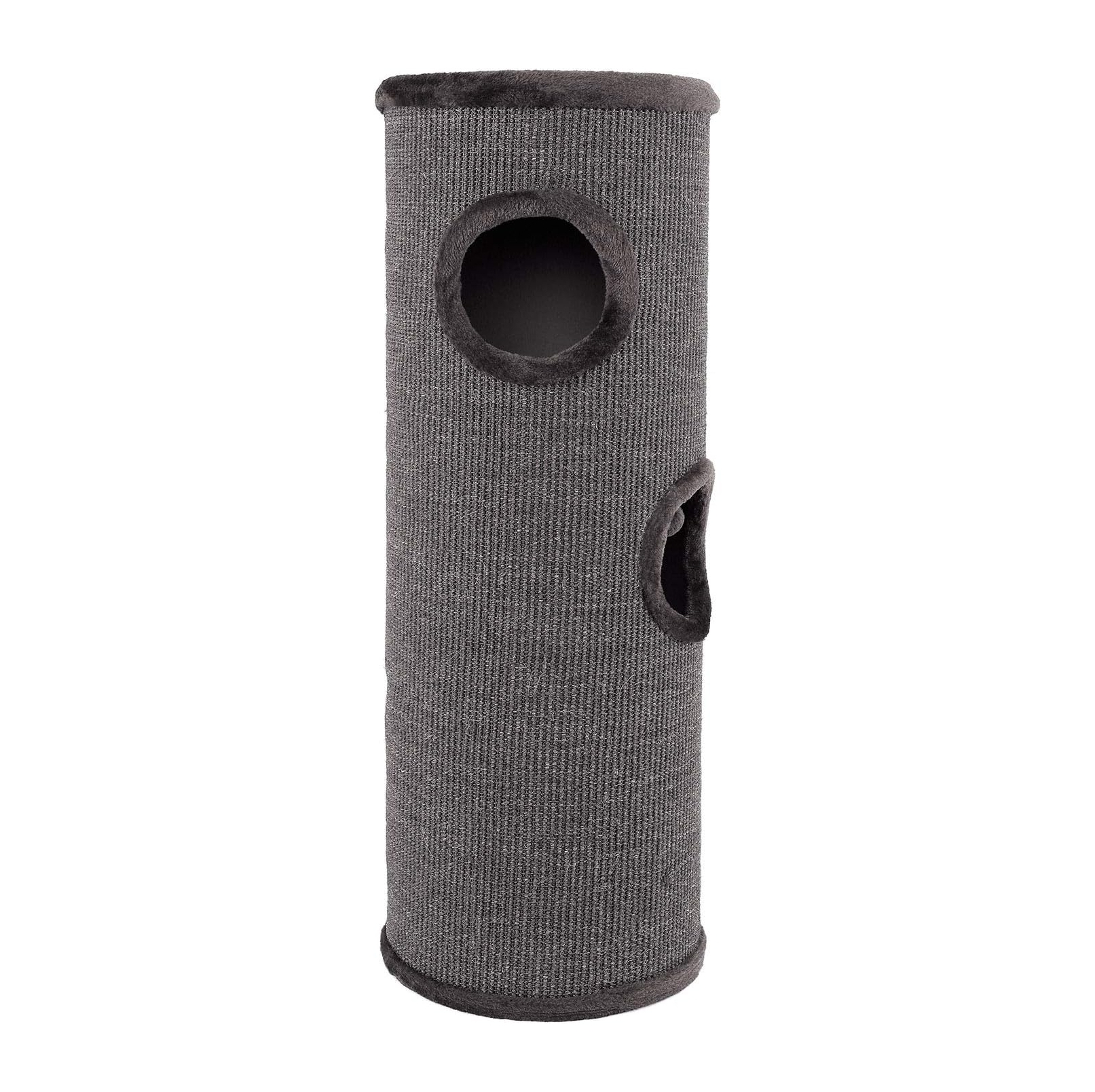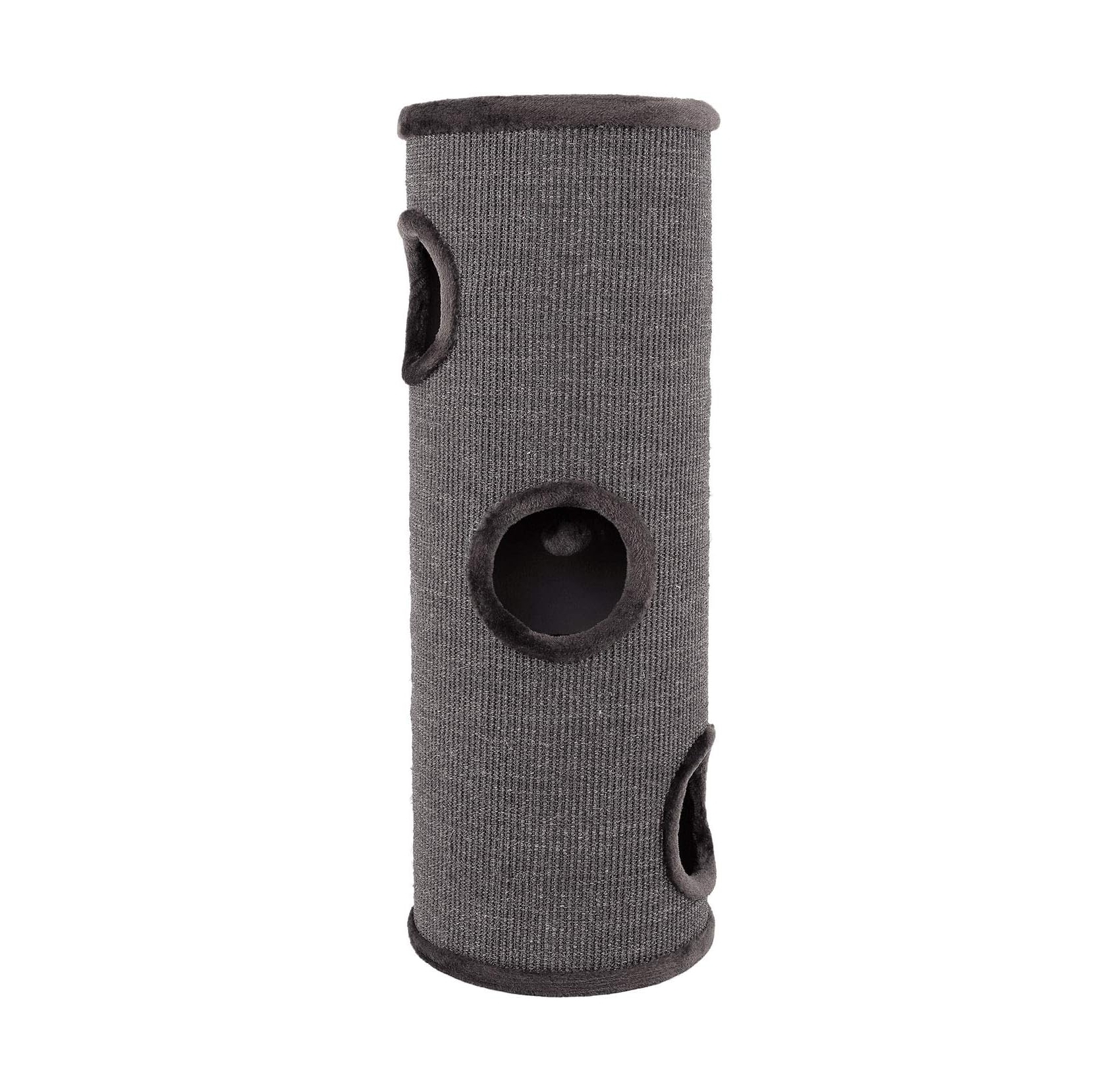 Este rascador no solo es un lugar para afilar las uñas, sino también un oasis de relajación. La plataforma superior, revestida con suave peluche, ofrece un cómodo refugio para que su gato descanse y observe su entorno. Dependiendo del modelo, incluye 2 o 3 entradas, todas forradas de peluche, que estimulan el instinto natural de juego y exploración. La pelota integrada añade un toque extra de diversión y actividad.