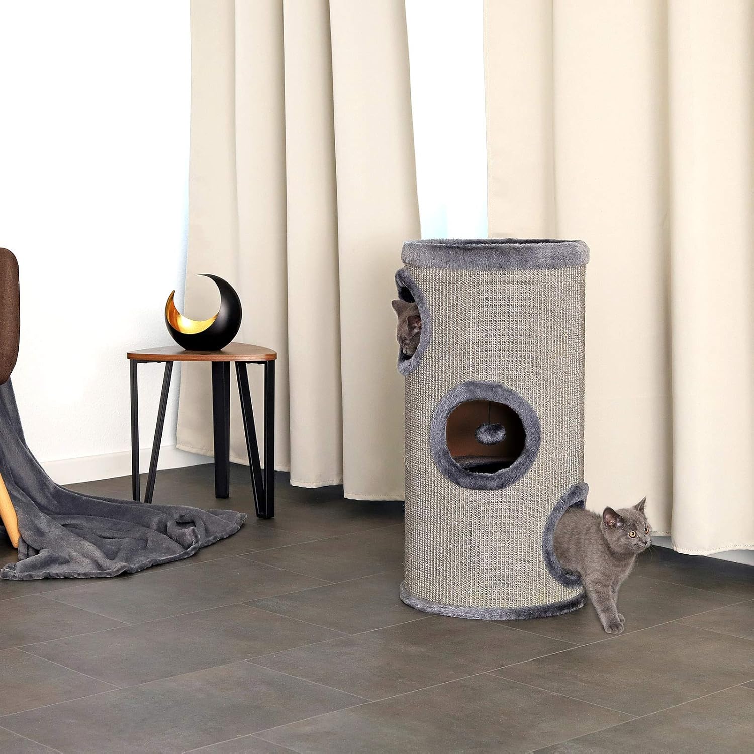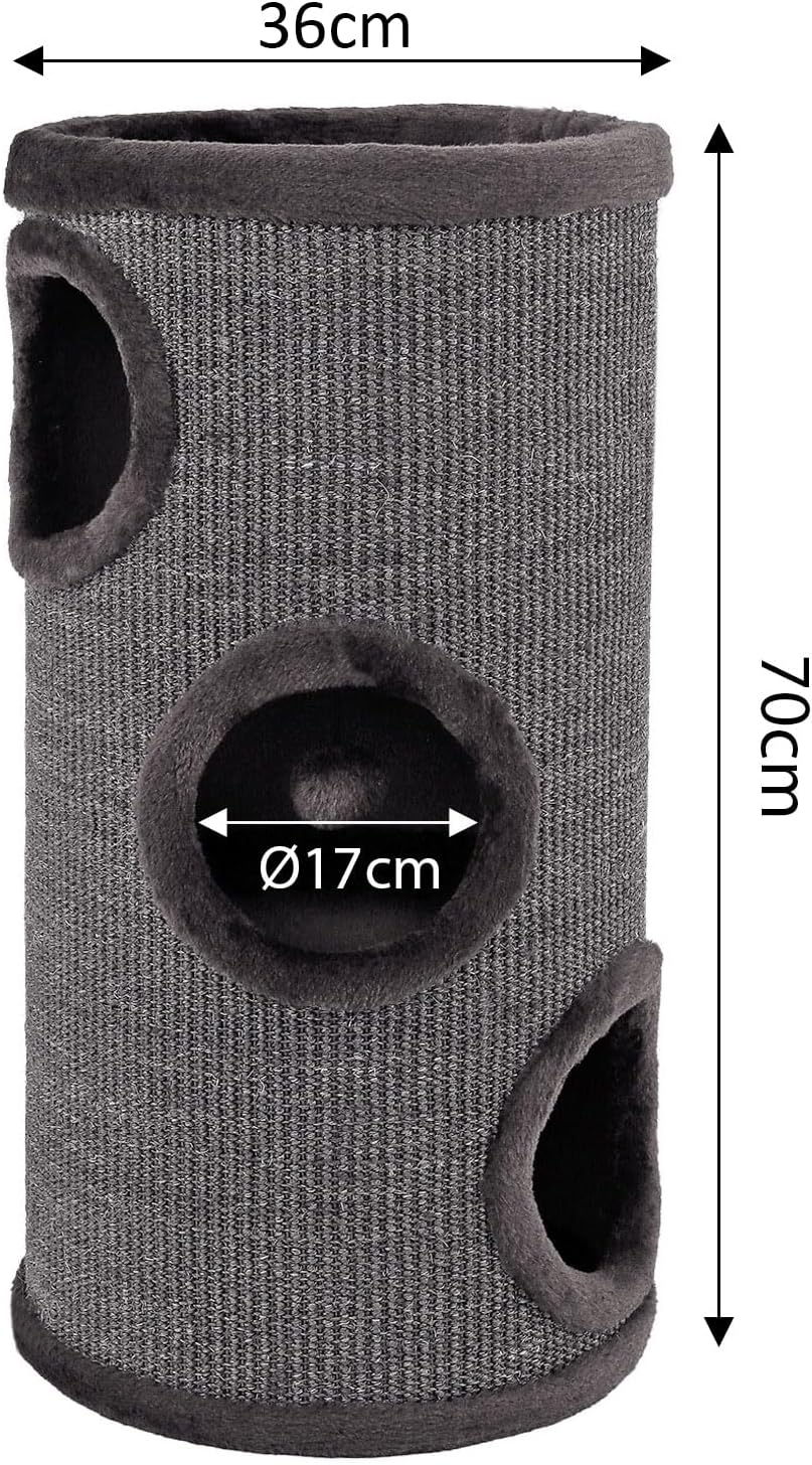 Las torres rascadoras cuentan con una plataforma superior revestida de suave peluche, ideal para que su gato descanse o observe su entorno cómodamente. Además, dependiendo del modelo, incorporan 2 o 3 entradas con bordes acolchados y una pelota de juego integrada, estimulando el instinto natural de caza y garantizando horas de diversión. Con tres elegantes opciones de color, el rascador para gatos lionto combina diseño moderno y funcionalidad, convirtiéndose en un imprescindible para cualquier amante de los gatos.