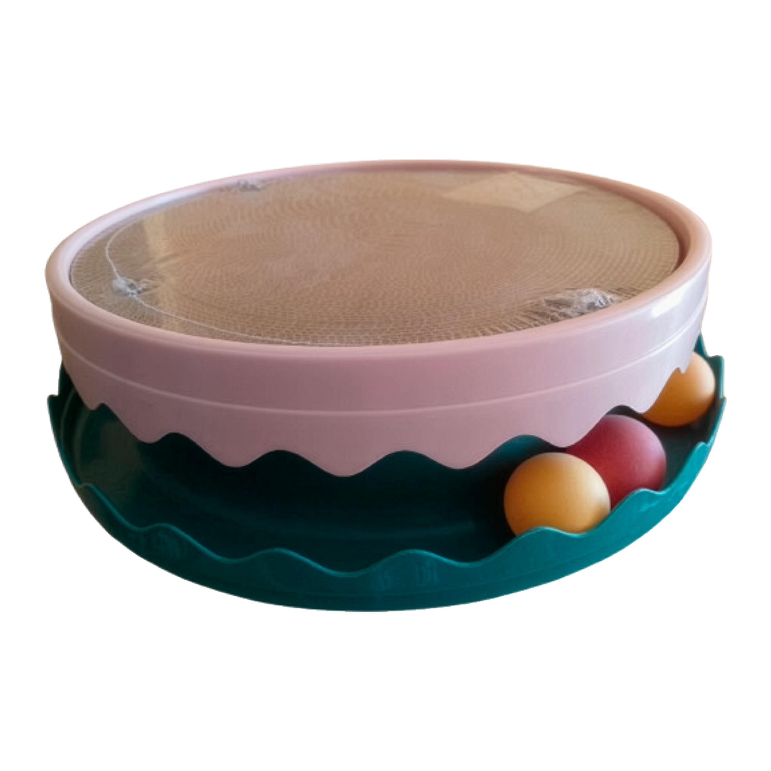 - Diseño: Rascador redondo con base plástica y decoración de colores pastel.