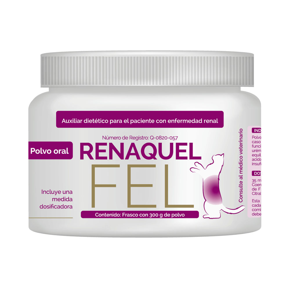 Auxiliar dietético para pacientes felinos con enfermedad renal. Polvo oral palatable auxiliar en el mantenimiento de la función renal en caso de enfermedad renal crónica en felinos domésticos. Ayuda a la función renal al disminuir la absorción intestinal del fósforo y toxinas urémicas, contribuye al mantenimiento de una presión arterial equilibrada, apoya en la prevención de lesiones renales, hipocalemia y acidosis metabólica que se presenta frecuentemente en felinos con insuficiencia renal.