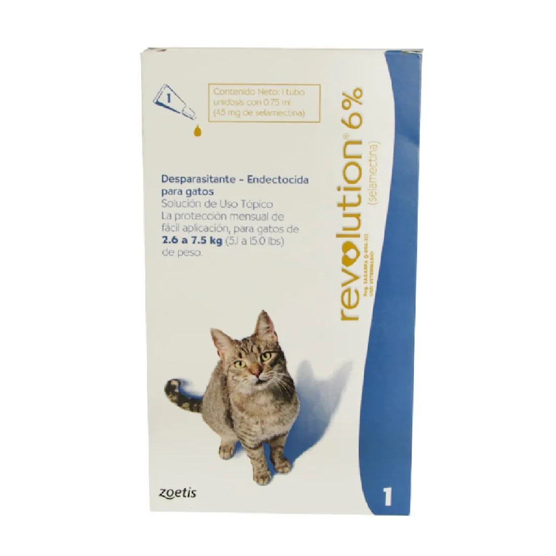 REVOLUTION 6% El ANTIPARASITARIO interno y externo para gatos de 2,6 Kg hasta 7,5 Kg de peso corporal de no menos de 6 semanas de edad. Administrado mensualmente, es un medicamento indicado para el tratamiento y control de infestaciones por pulgas (especies de ctenocephalides), control de microfilarias del parásito Dirofilaria imitis (gusano del corazón) y el tratamiento y control de ácaros de las orejas (Otodectes cynotis) y los piojos (Trichodectes canis y Felicola subrostratus). También indicado para el tratamiento y control de los anquilostomas (Ancylostoma tubaeforme) y los nemátodos intestinales (Toxocara cati) en gatos. Inocuidad en hembras gestantes y lactantes.