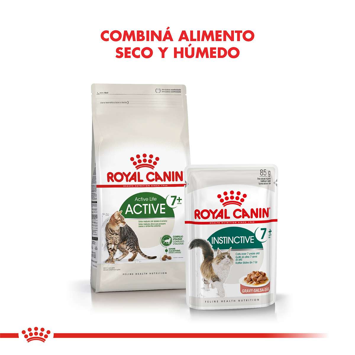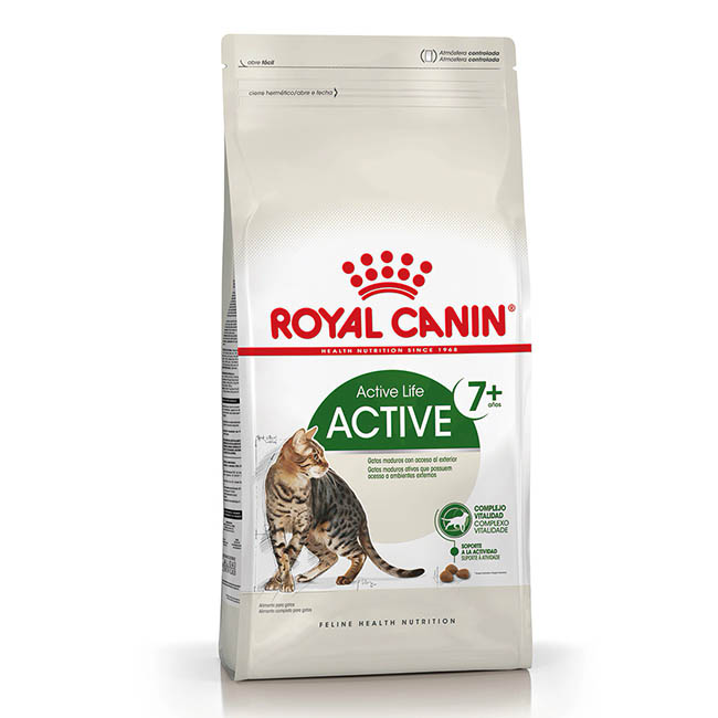 Alimento para gatos maduros con acceso al exterior, a partir de los 7 años de edad. Royal Canin Active 7+ ayuda a los gatos que muestran los primeros signos de envejecimiento, ya que está formulado con un adecuado balance de nutrientes que incluye al té verde, vitamina C, EPA & DHA. Presenta un contenido alto en calorías que cubre los requerimientos energéticos de los gatos activos y contribuye al mantenimiento de la función renal gracias a un contenido adaptado de fósforo.