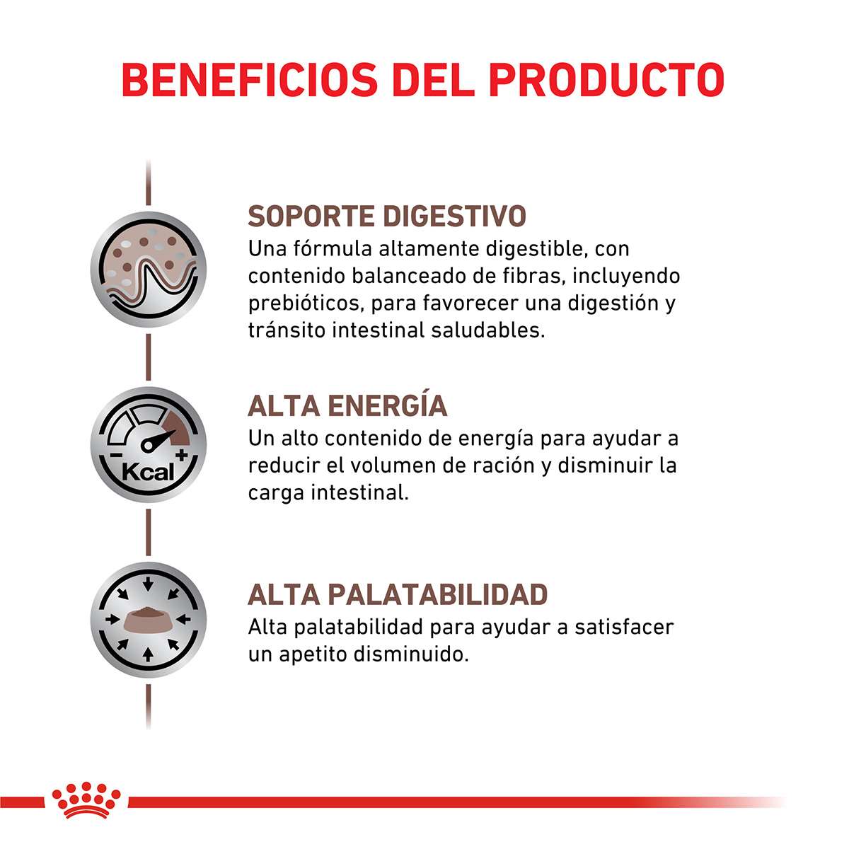 Un alimento para gatos, formulado para contribuir al control de los desórdenes intestinales agudos que afectan la absorción y para promover la recuperación nutricional y la convalecencia. Contiene ingredientes de alta digestibilidad, un nivel elevado de electrolitos, nutrientes esenciales, y un contenido energético elevado.