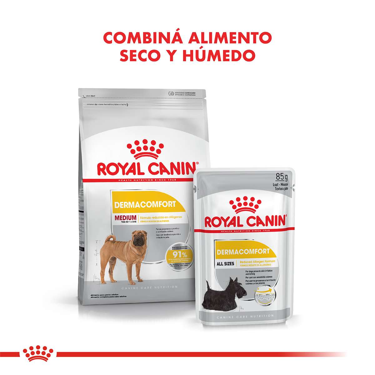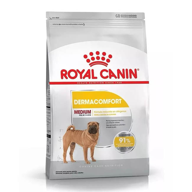 Alimento para perros adultos y maduros de talla mediana (de 11 a 25 kg) propensos a la irritación cutánea y al prurito, a partir de los 12 meses de edad. Royal Canin Medium Dermacomfort presenta una fórmula específica con una selección de fuentes de proteínas de muy alta calidad y está especialmente indicado para los perros de talla mediana propensos a la irritación de la piel y al prurito. Su combinación única de nutrientes ayuda a reforzar la barrera cutánea, ya que combina ácidos grasos Omega 6 (incluyendo al ácido gamma linolénico) y ácidos grasos Omega 3 (incluyendo EPA y DHA) conocidos por sus efectos beneficiosos para la piel. Además, ayuda a combatir los radicales libres gracias a su combinación sinérgica de antioxidantes.