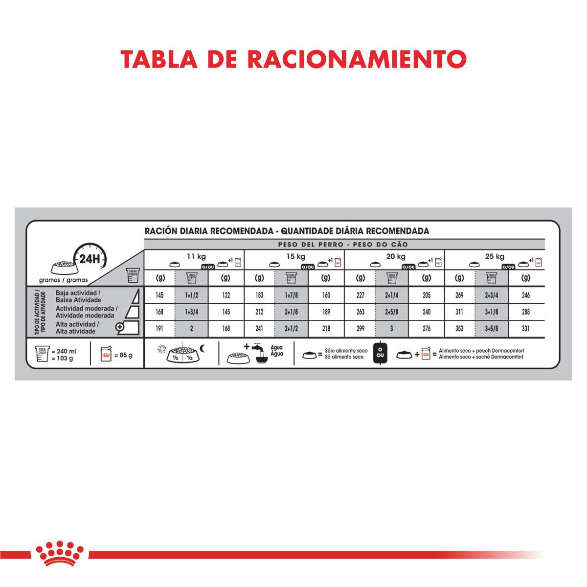 Proteína bruta (mín.): 22%; Extracto etéreo(mín.): 15%; Fibra cruda (máx.): 3,8%; Minerales (máx.): 7,8%; Humedad(máx.): 11%; Calcio (mín.): 0,48%, (máx.): 1,12%; Fósforo (mín.): 0,36%, (máx.): 0,84%; Sodio (máx.): 0,56%. ENERGÍA METABOLIZABLE: 3.954 kcal/kg. ENRIQUECIMIENTOS POR KG (mín.): Vitaminas: A: 29.900 UI; D3: 800 UI; E: 600 mg; C: 300 mg; B1: 27,6 mg; B2: 49,8 mg; Niacina: 496 mg; Pantotenato de calcio: 147,9 mg; B6: 76,9 mg; B12: 0,14 mg; Biotina: 3,12 mg; Colina: 1.800 mg; Ác. Fólico: 14 mg. Oligoelementos: Cobre: 14 mg; Hierro: 45 mg; Manganeso: 59 mg; Yodo: 4,5 mg; Zinc: 176 mg; Selenio: 0,1 mg.