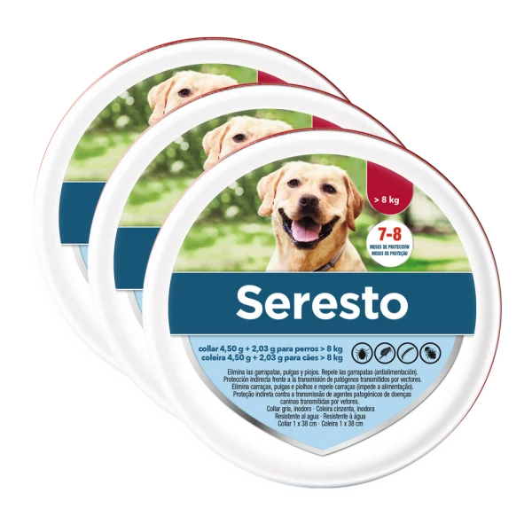 El collar antiparasitario Seresto de larga duración mantiene a tu mascota segura durante 8 meses lejos de cualquier acción de parásitos e insectos.