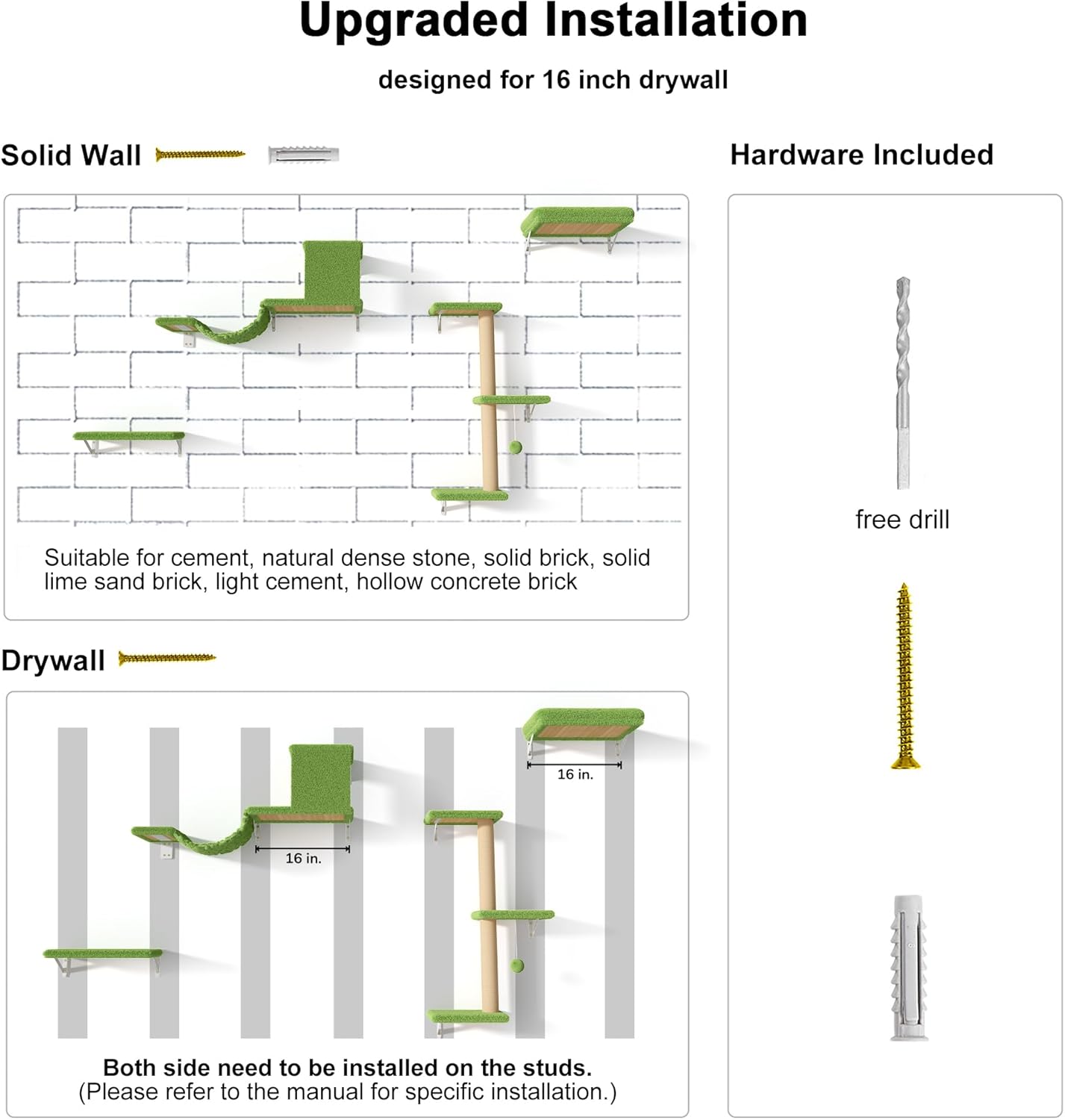 - Un paraíso vertical para tu gato: Este conjunto de muebles de pared para gatos está diseñado para transformar cualquier espacio en un auténtico parque de diversiones felino. Incluye un puente colgante, una cama de pared, un poste rascador y un estante. ¡Tu gato podrá descansar, trepar, afilar sus garras y jugar sin límites, todo en un solo lugar!
