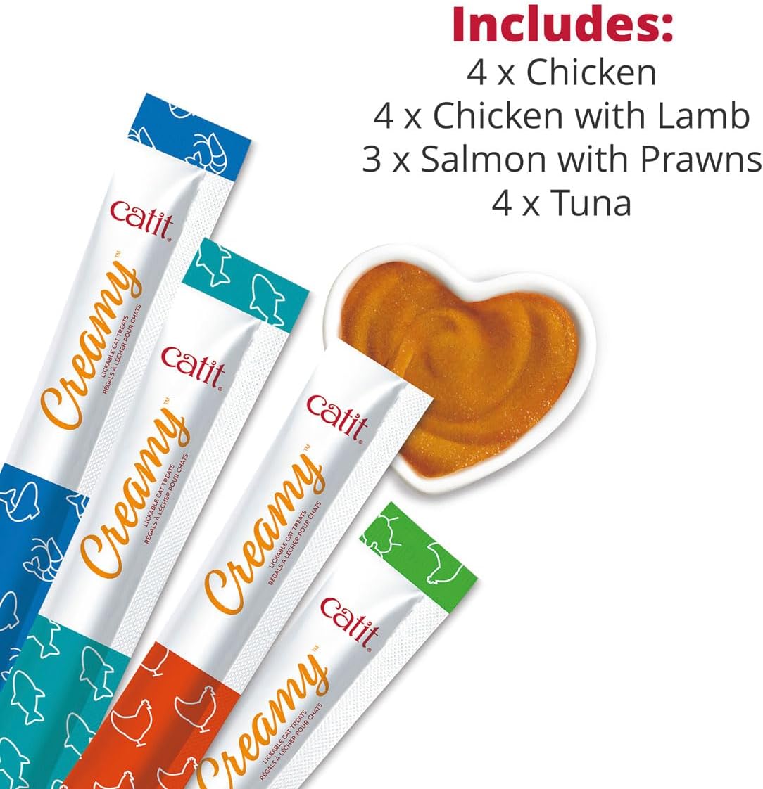 Incluye: 4 tubos sabor pollo, 4 tubos sabor pollo con cordero, 3 tubos sabor salmón con gambas y 4 tubos sabor atún. Con el snack húmedo para gatos catit, tu compañero disfrutará de una experiencia única llena de sabor y beneficios nutricionales.