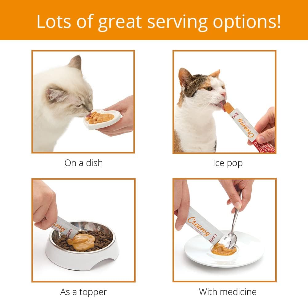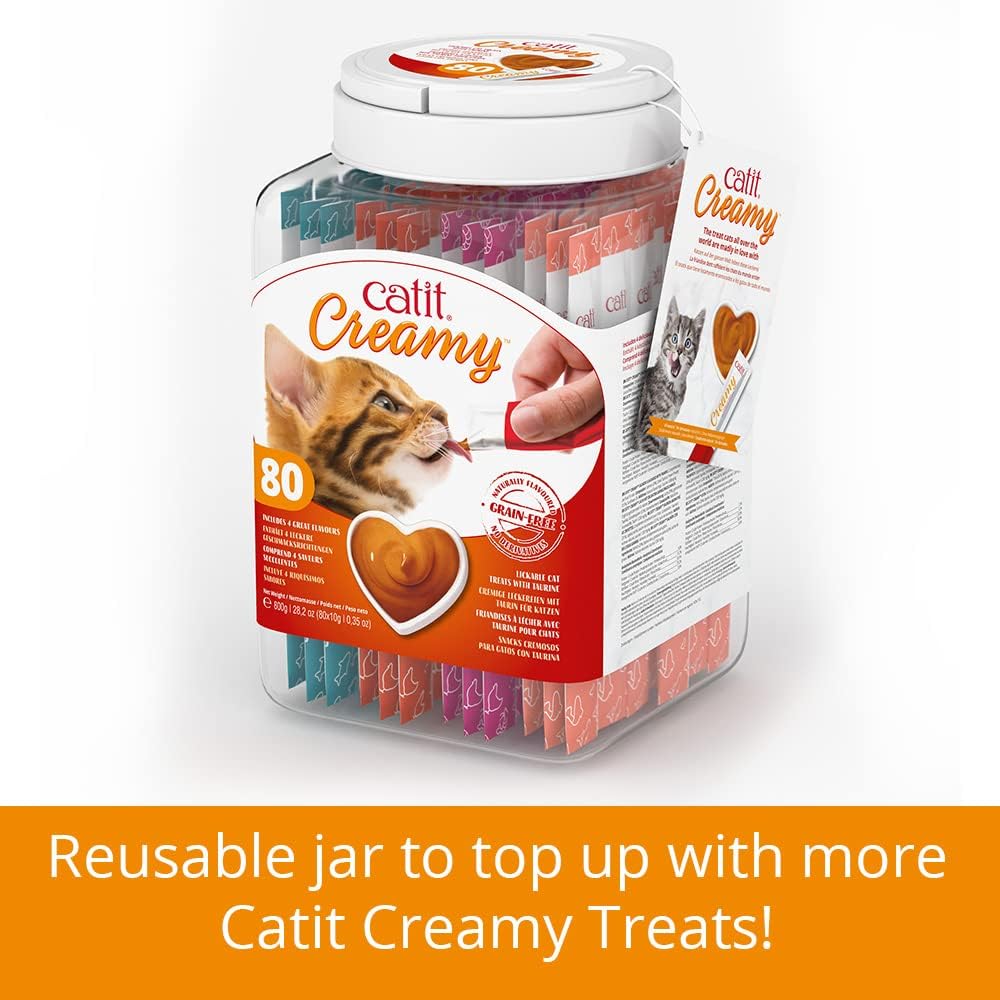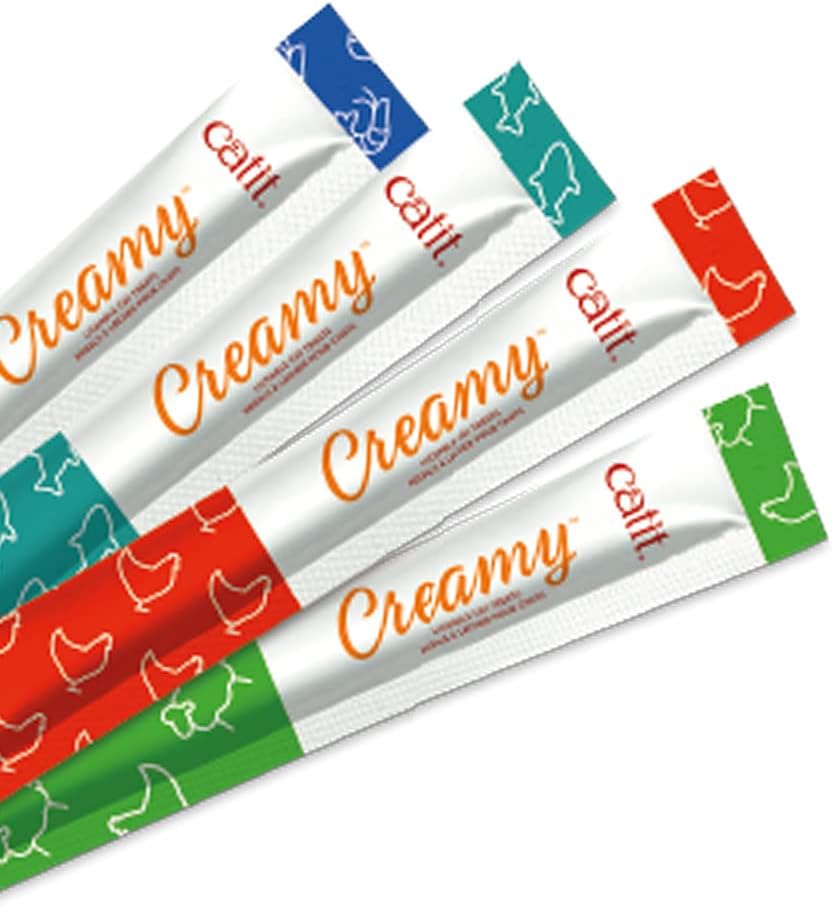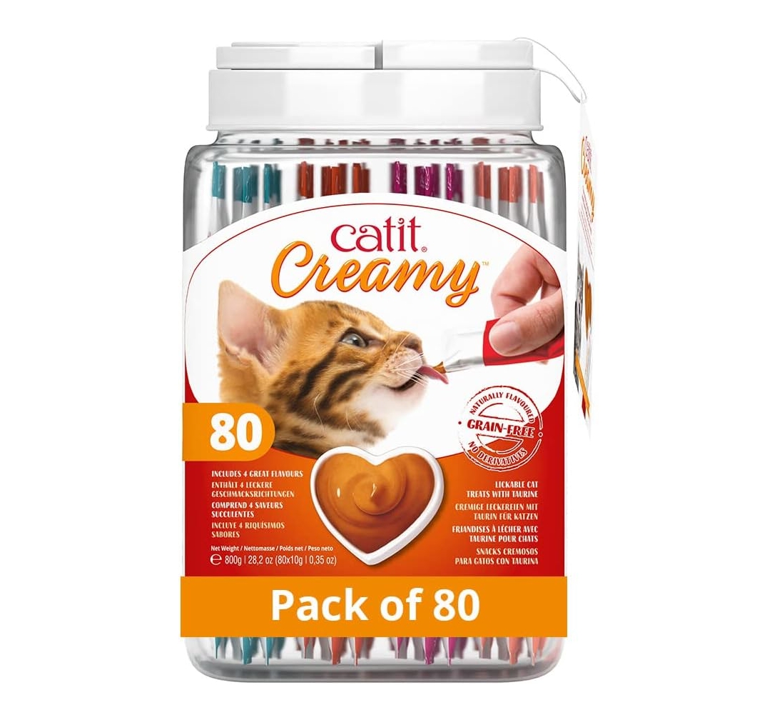 Ofrecido en una práctica presentación de 20 tubos de 10 g cada uno, Catit Creamy está disponible en irresistibles sabores como pollo, pollo con cordero, salmón con gambas y atún. Además, su fórmula está diseñada pensando en la salud de tu gato: libre de maíz, granos, trigo y soja, así como de sabores, colorantes y conservantes artificiales.