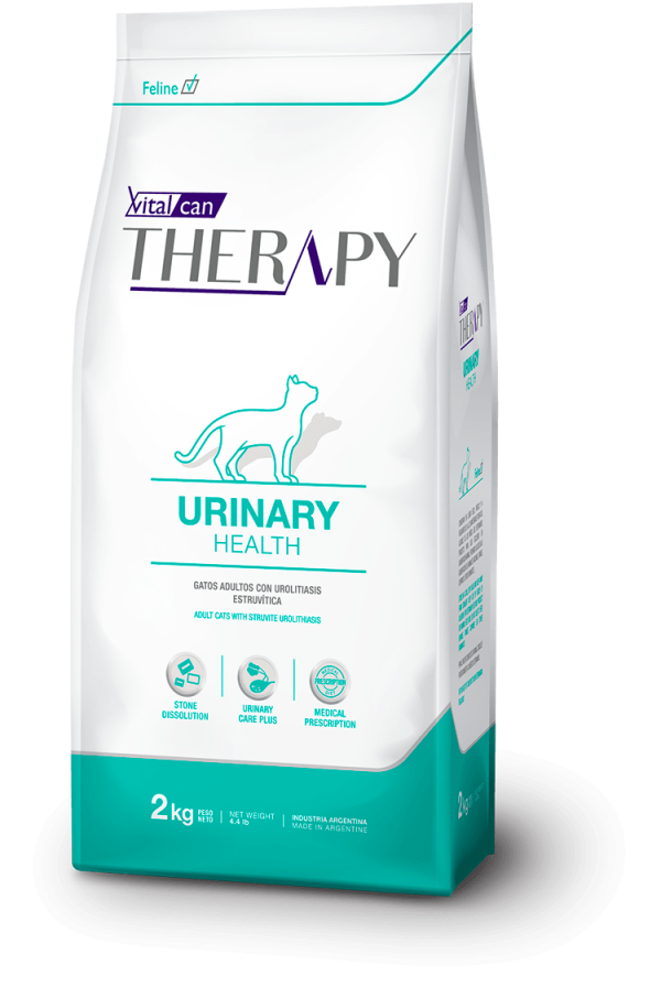 VITALCAN THERAPY FELINE URINARY HEALTH es un alimento completo de prescripción para gatos que colabora en la disolución de los cálculos urinarios de estruvita. Su fórmula está indicada en las principales patologías del tracto urinario inferior felino (FLUTD). Este alimento contiene elevados niveles de proteína de alto valor biológico, bajos niveles de magnesio y antiinflamatorios naturales. Además esta fórmula estimula la ingesta de agua con el objeto de lograr una mayor diuresis.