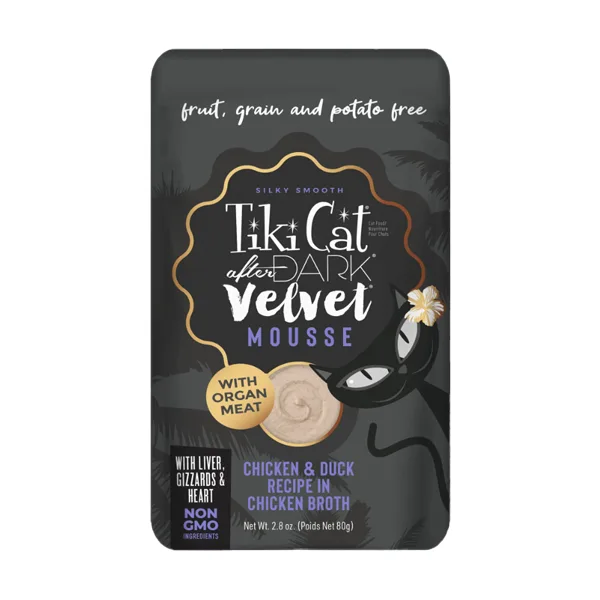Tiki Cat After Dark Velvet Mousse Pollo y Pato en Caldo de Pollo es una opción gourmet para gatos de todas las edades. Su textura suave y cremosa, elaborada con carne de pollo y pato de alta calidad y un 12% de proteína bruta, garantiza una experiencia irresistible hasta para los paladares más exigentes.